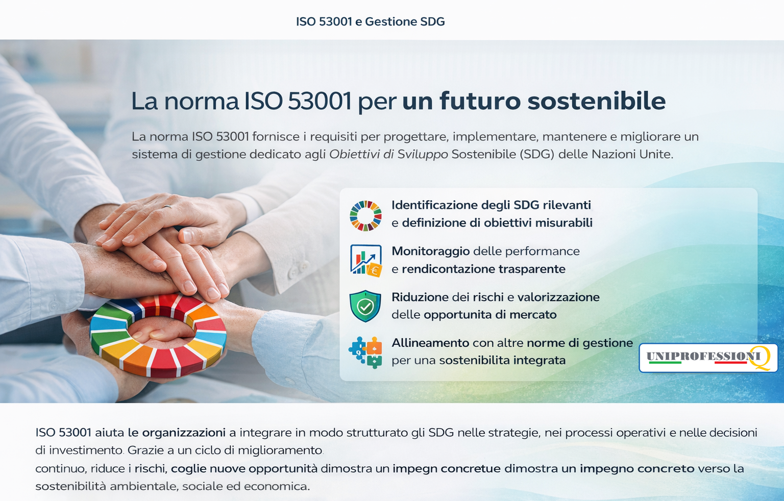 UniProfessioni promuove la diffusione della cultura della ISO 53001 come strumento per integrare in modo strutturato gli Obiettivi di Sviluppo Sostenibile (SDG) nelle organizzazioni. In un contesto in cui la sostenibilità assume un ruolo sempre più centrale nelle decisioni pubbliche e private, la comprensione e l'applicazione di modelli di gestione coerenti con gli SDG rappresentano un elemento chiave per generare valore nel lungo periodo.